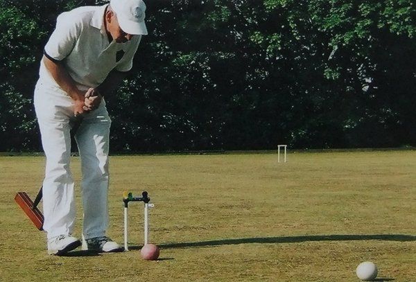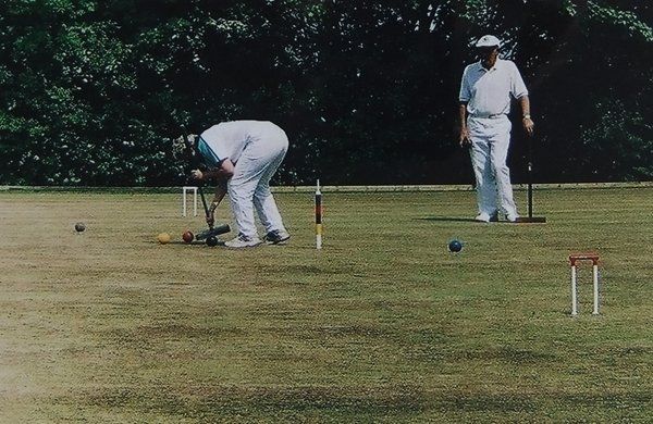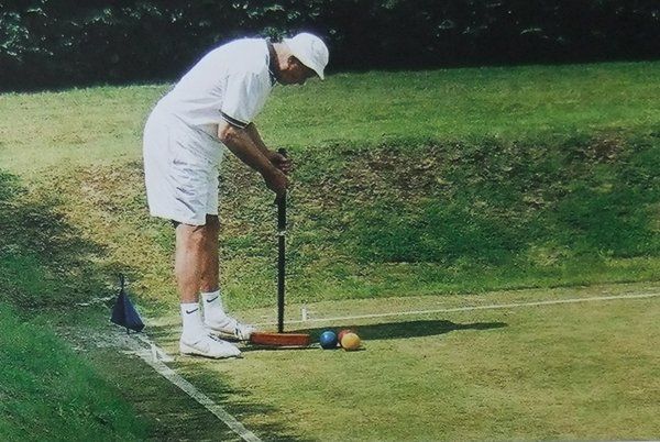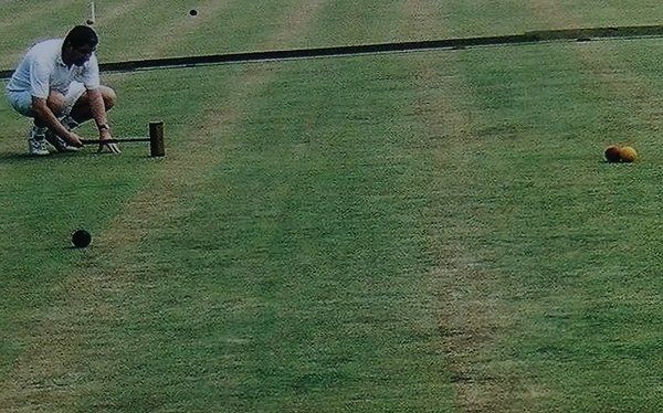 Checking accuracy of line for the croquet shot and following shot to peg out the yellow and red, so winning the game